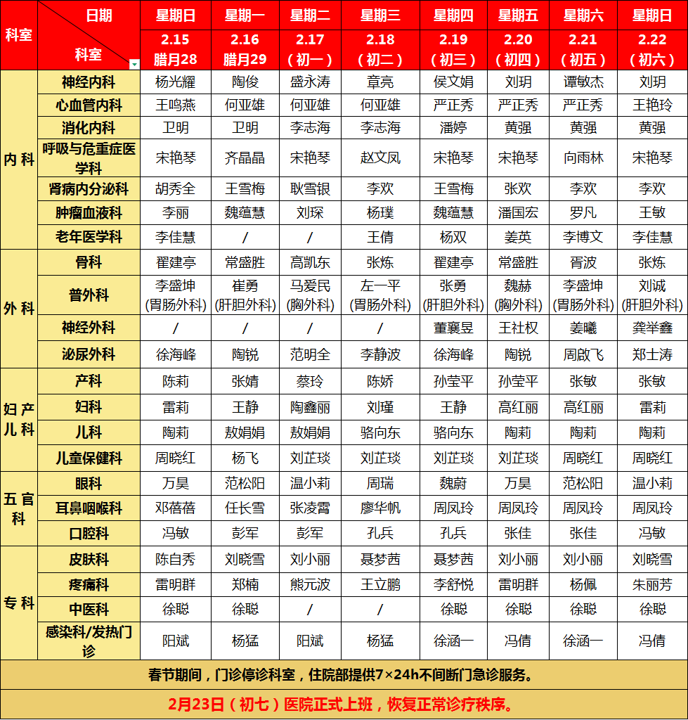 襄阳市第六人民医院2026年春节期间门诊安排!